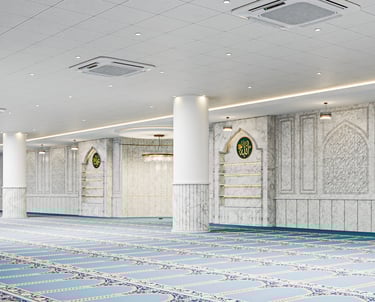 A renovation project for the inhouse mosque at the Parliament Building in Islamabad, Pakistan. The new design features The existing masjid has a lack of windows and natural light which needed to be countered with a striking white natural stone and intricate jali work combined with a light material palette.