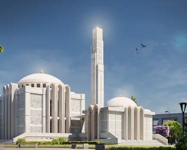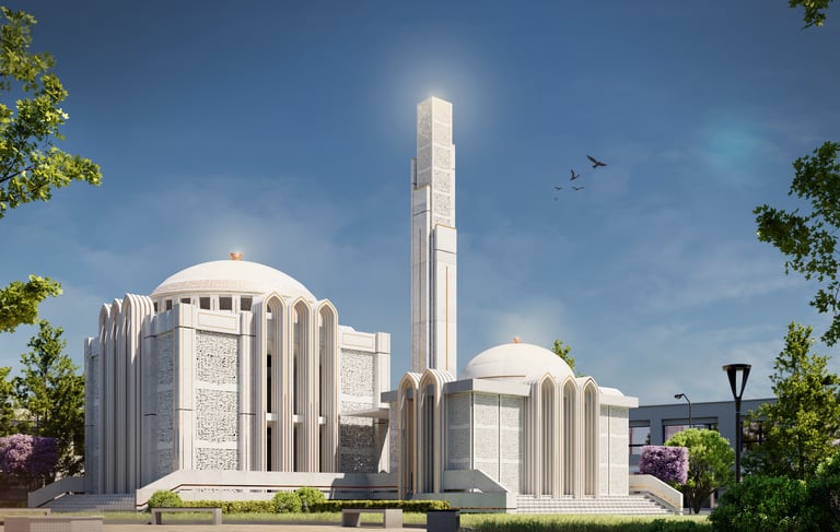 The Central Masjid for Grand City Mardan. Clad in striking white stone with brass accents and intricate jali work. The Monolithic form for both the main masjid and the minar offer a happy balance between tradition and contemporary design