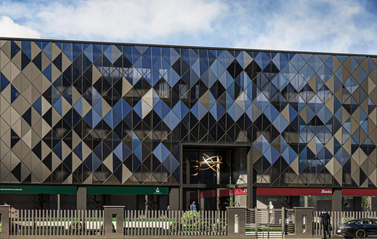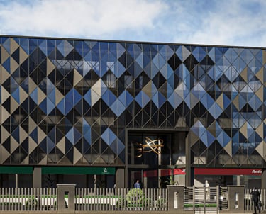Employing cutting edge grid shell technology this origami inspired parametric form is an innovative feat of design and construction. The undulating form makes for a wonderful interplay of reflections on the insulated glass façade. Collaboration with ZAES